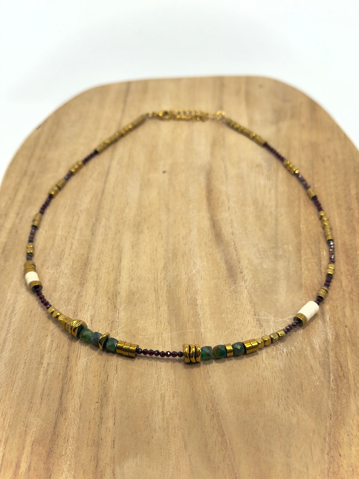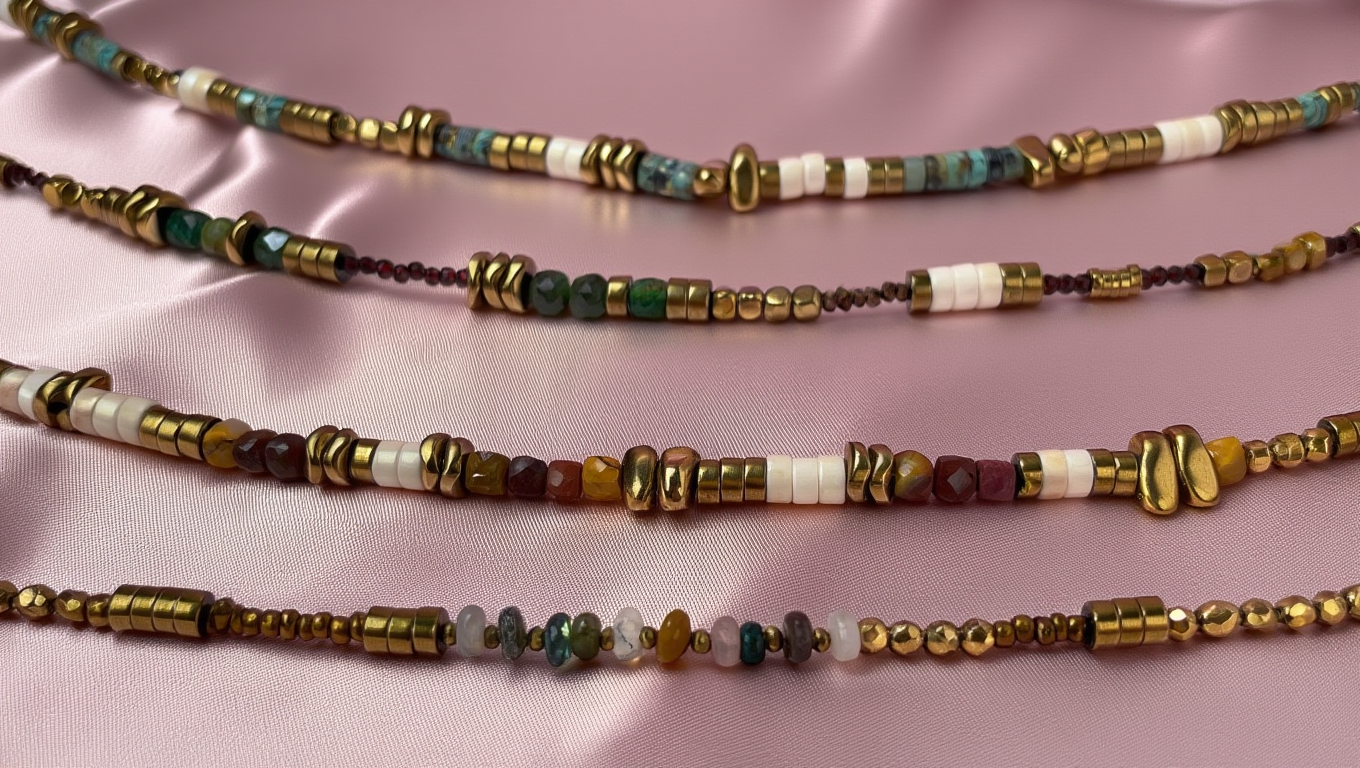 Je mixe avec soin des matériaux choisis pour leur qualité et leur beauté : pierres naturelles, acier inoxydable, perles d’hématite dorée et perles de verre.